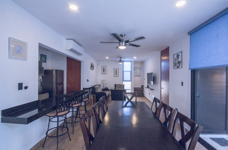 equipada con barra desayunadora, baño completo con puerta de acceso