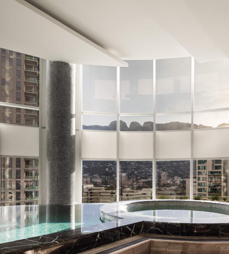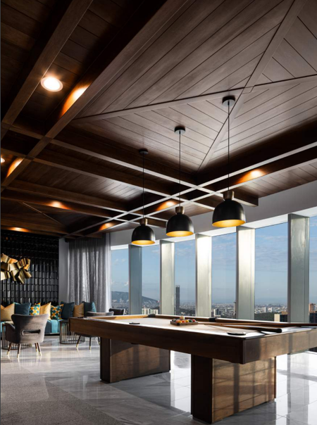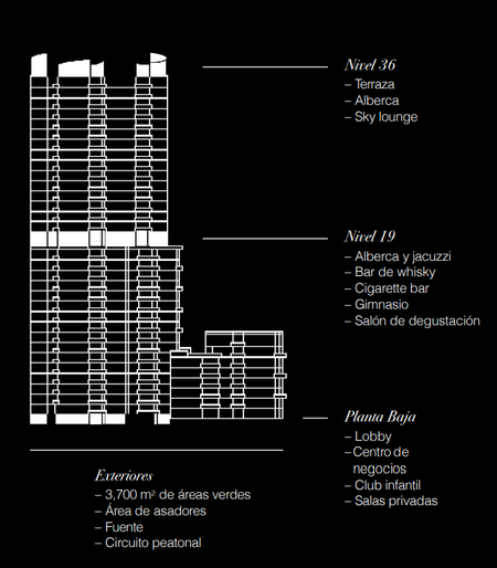 Piso 18: Alberca y jacuzzi Yang, Terrazas y asadores, Salón de degustación, Bar de whiskey, Bar de puros, y Gimnasio.