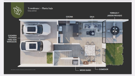 Cuenta con un área de construcción aproximada de 98 m2; con cochera para 2 vehículos techados. Al ingresar, se encuentra un medio baño y las escaleras para subir al segundo piso. De igual manera, nos encontramos con los espacios bien definidos de Sala, Comedor y Cocina. Posteriormente, con un ventanal para acceso a la terraza techada y jardín privado, y un acceso al parque central y a las áreas