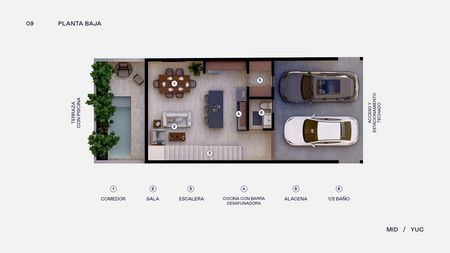 P.B. Comedor-sala, escalera, cocina con barra desayunadora, alacena, 1/2 baño, terraza con piscina, acceso y estacionamiento techado.